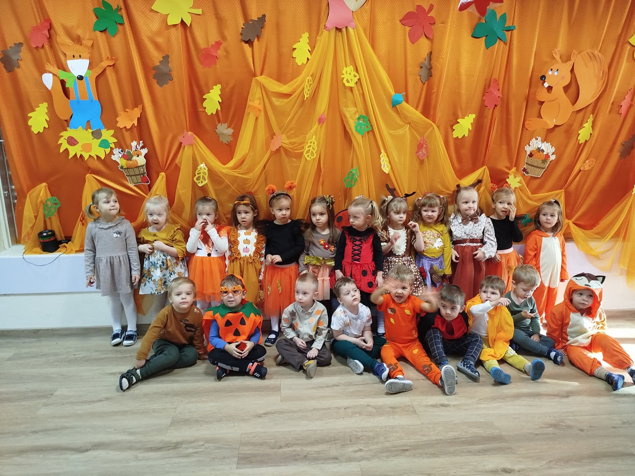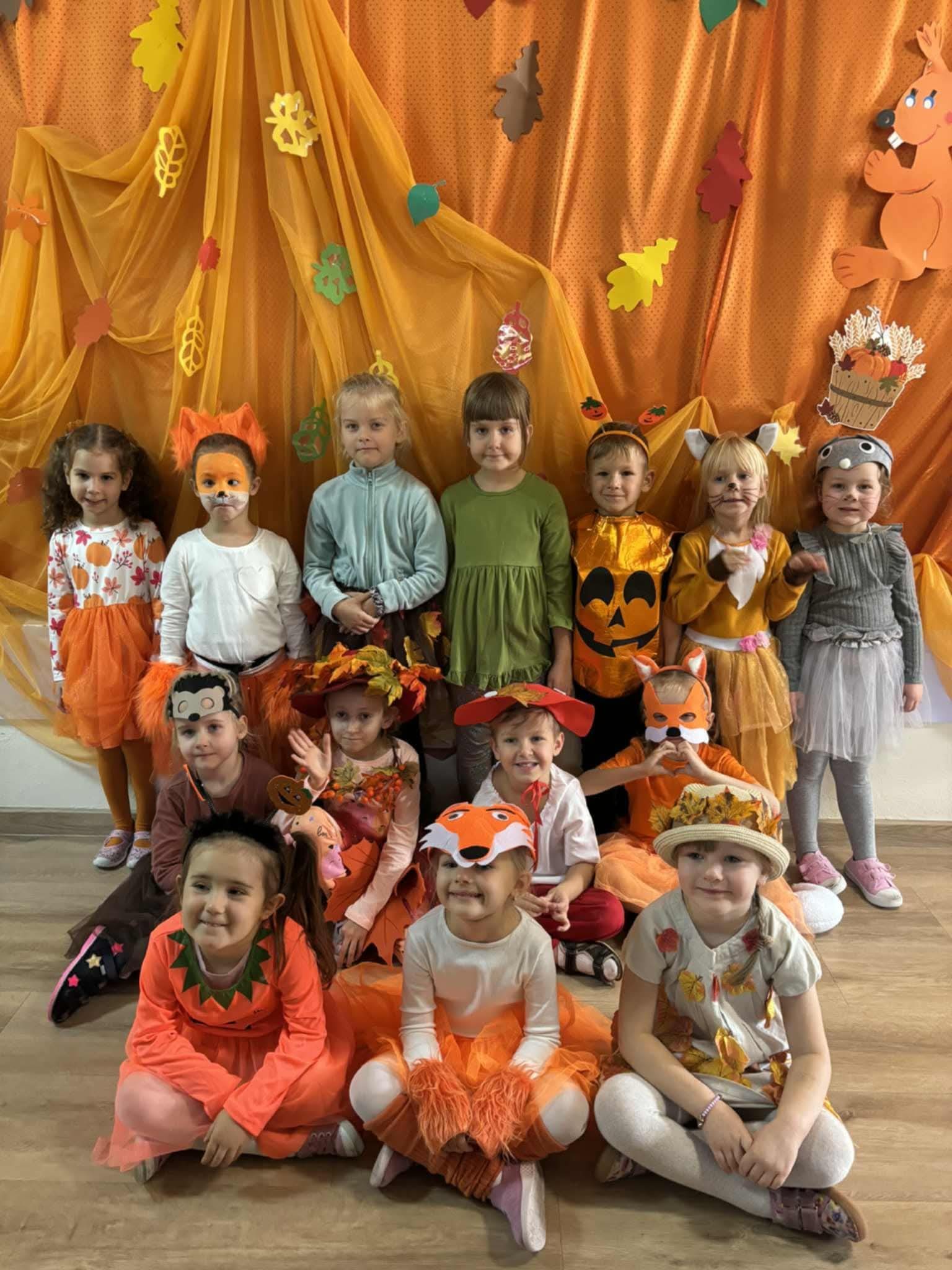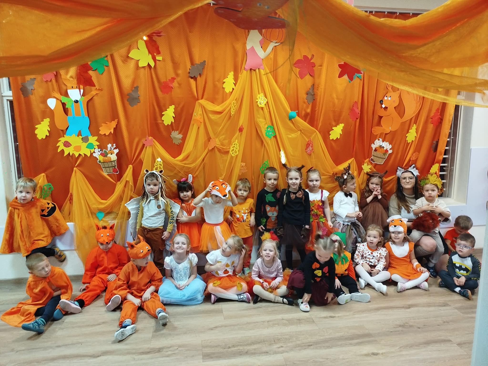 Zaprosiliśmy jeże, dyniowe duszki, grzybki, muchomorki, wiewiórki, liski, kolorowe listki. Wszystkie przedszkolaki poprzebierały się w jesienne kreacje i ruszyły muzycznym krokiem na zabawę taneczną.